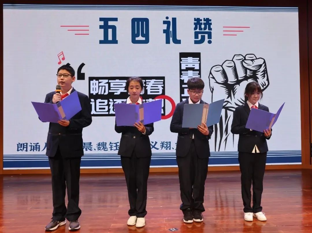 正值青春身处和平年代的我们,应该感恩当年五四运动的青年们,是他们的英勇斗争,为我们创造了美好的今天。初中部广播站孙义翔、刘昊阳、杨智晨、魏钰洁带来诗朗诵《五四礼赞》,深情讴歌五四精神。