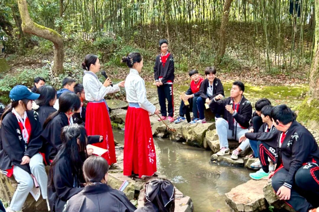 而兰亭——旅途的第二站,因王羲之“天下第一行书”的名作《兰亭集序》而名闻海内外。相传春秋时期越王勾践曾在此植兰,汉时设驿亭,故名兰亭,后因修禊传统逐渐演变为士大夫文人的水畔雅集,即曲水流觞:游戏者临坐水畔,任由置于水面上托盘内的酒杯顺水漂流,杯停所在的游戏者即兴赋诗。孩子们围坐一团,也体会了下文人墨客的这般雅兴。