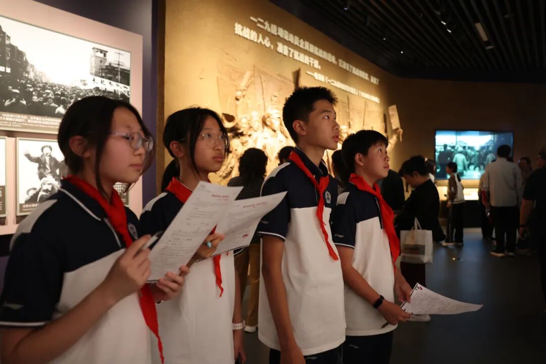 初一年级以“9·3”中国抗日战争胜利纪念日阅兵仪式为爱国主义教育的开篇,围绕“铭记历史,强国有我”这一主线,开展了电影课程、历史拓展课堂、跨学科融合教学、社会实践以及主题汇报展示等长线活动。同学们从影像中感受民族的坚韧,从课堂中读懂历史的脉络,从行走中触碰家国的温度。9月18日当天,初一年级以“铭记历史时刻,厚植家国情怀”为主题参观抗日战争纪念馆,孩子们饱含敬畏之心,触摸历史脉搏,不忘国殇,致敬英雄脊梁。