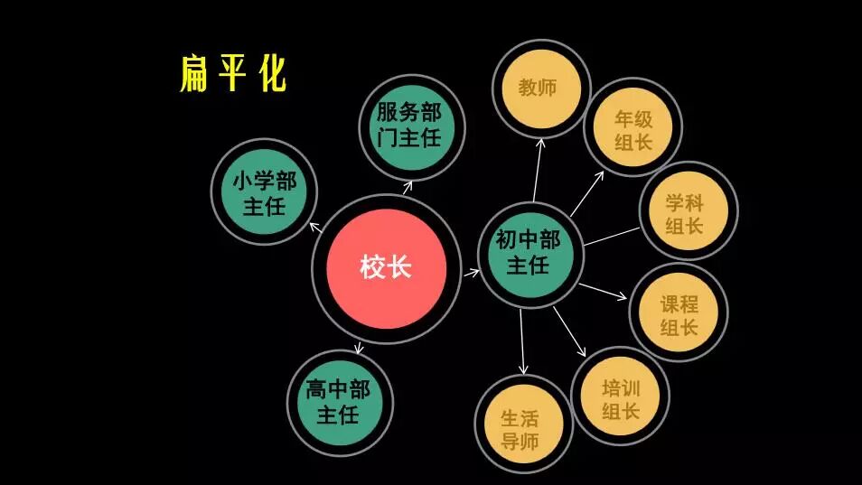 随着学校的发展,应该如何调整组织建构,提高管理的有效性呢?是不是要复制他校的成功模式?是不是要完全遵循固有的架构?我认为,组织建构的目的是提高管理效能,减少冲突和内耗,要适合自己。“借来的火,点不亮自己的心灵”,我们不照搬硬套他人模式,不囿于条条框框,而是根据学校自身发展,在实践中摸索出一种符合自身发展的组织构建模式。我们取消了在学校层面同时设置教务处和德育处,将教务处改成课程中心,服务学校课程研究和课题申报;设置了对外交流中心,接待越来越多的参访学习者;成立了新闻中心,专门做对外宣传和品牌文化建设......一切组织建构的调整,都是顺势而为,水到渠成的结果。