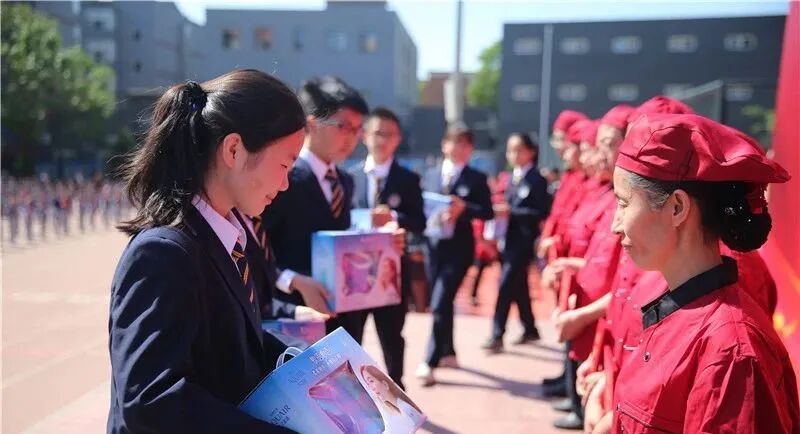 第一件发生在2019年劳动节后的第一次升旗仪式上,由小学20位、初中8位、高中7位同学代表和校领导一起为在学校导育、保洁、保安、食堂、后勤岗位上做出突出贡献的43位优秀工作人员颁发了“世纪劳动奖”。