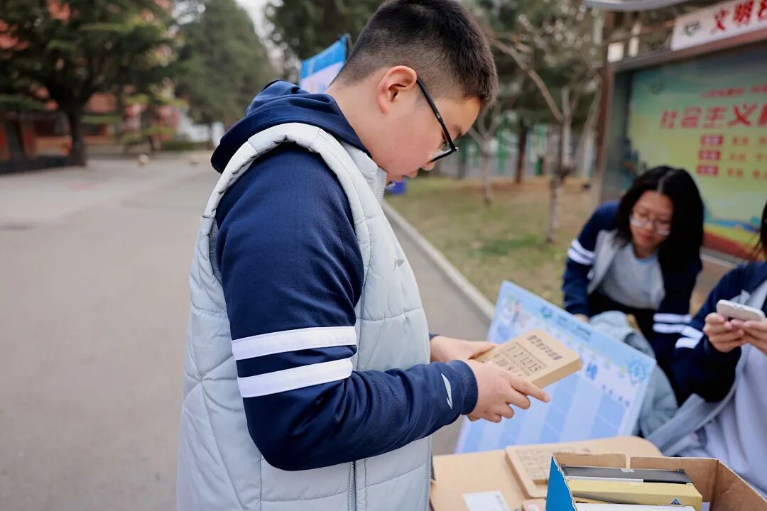 十二面体日历摊位前,几位同学正对照成品认真组装,完成制作后兴奋地向同伴展示成果。