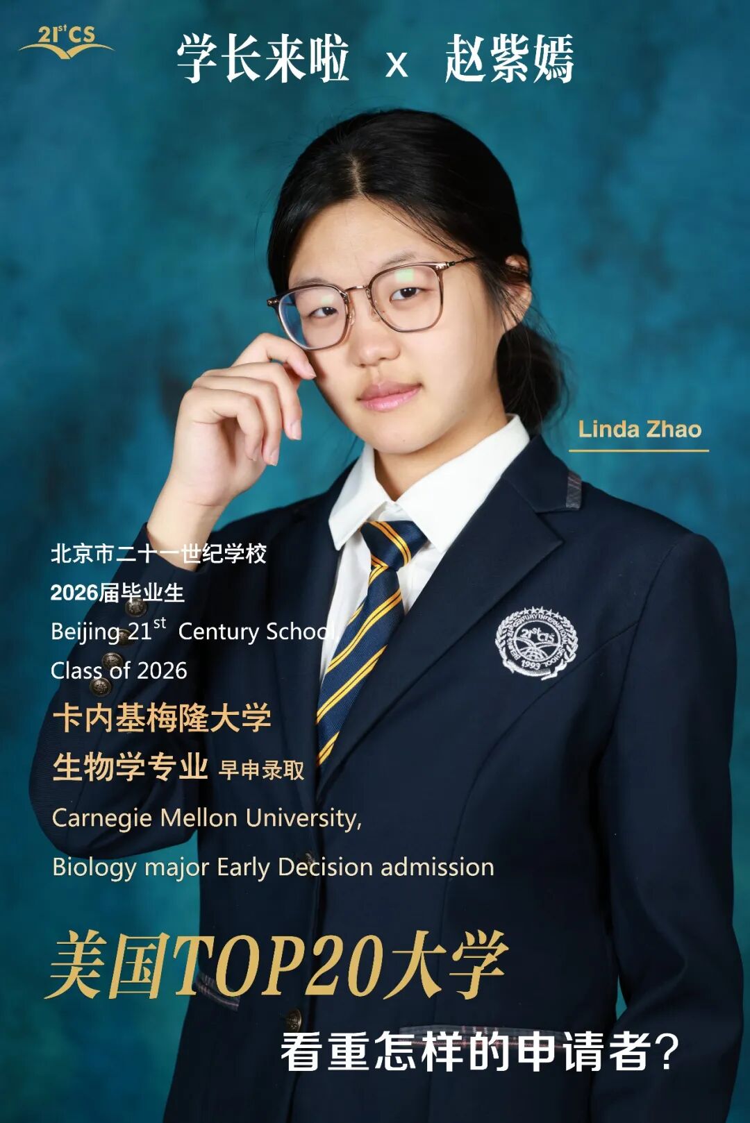 在这个过程中,赵紫嫣得到了申请规划唐老师、班主任冉老师等很多老师的支持和鼓励。从小学一年级就在二十一世纪学校就读,紫嫣说:“老师会敏锐的发现我们每个人的情绪,然后用一种非常契合每个人的方式去疏导,挺触动我的。”